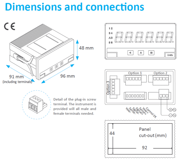 Preiswerte Digitalanzeige für Wägezellen / Kraftsensoren mit 4- oder 6- Leiteranschluß, Standard, 96 x 48 mm (1/8 DIN) groß, 6 Stellen mit 14 mm Ziffernhöhe. Liefert eine Erregerspannung zur Versorgung der Wägezelle, konfigurierbar für 5 V DC und 10 V DC. Bis zu 60 Abtastungen pro Sekunde. Funktionen ‚Tara‘ und ‚Auto-Tara‘. Optionale Ausgangsmodule mit Relais, Transistor, SSR-Steuerung, Analogausgängen und MODBUS RTU-Kommunikation. Anschlussspannung: 230 V AC. Es sind 16 verschiedene Varianten bestellbar.